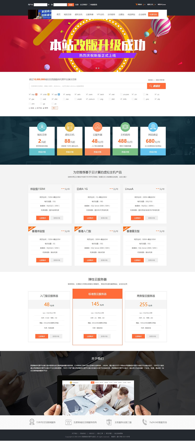 系统的主要特色有:开源免费、模板分离使用方便、可以不依赖于上级代理独立运行、客服托管系统,降低售后服务压力、在线升级、无限级别代理平台、免费集成新网万网等五大域名注册接口、功能强大界面美观等