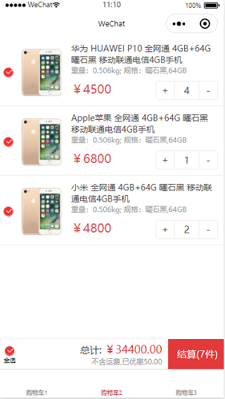 商城小程序简介: 该小程序模板是一款用于收银结算页面的前端小程序模板,模板采用微信WEB开发工具开发,内含三个购物车前端页面。非常适合微商朋友定制修改自己的网上商城小程序等等!小程序模板截图: