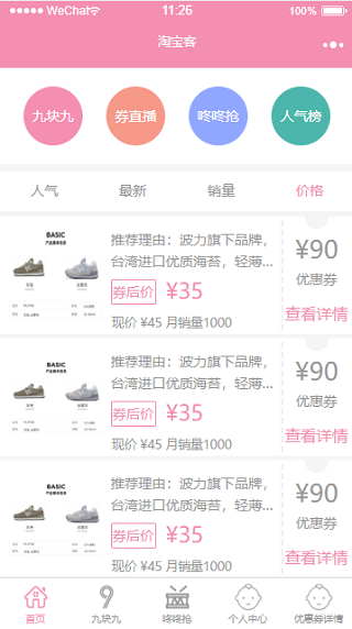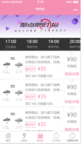 商城小程序简介: 该小程序模板是使用微信WEB开发工具设计的一款优惠券限时抢小程序的模板,可帮助你轻松制定相应的优惠活动等等!使用方便,采用微信即可使用打开,非常适合做微商的朋友下载使用等等!小程序模板截图: