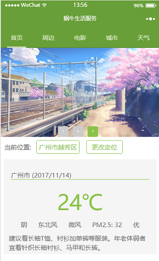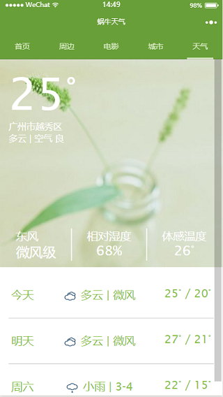 小程序模板简介: 该小程序模板是一款蜗牛周边生活服务的小程序模板,用户可以轻松找到周边相关的生活服务,包括天气、电影等等。是一款十分实用的周边性微信小程序!小程序模板截图: