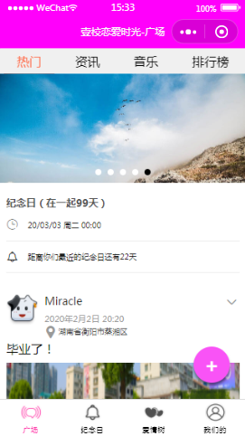 小程序模板简介: 该小程序模板是一款集娱乐恋爱节日记录的微信小程序,是一款非常适合情侣使用的微信版娱乐生活小程序,轻松帮助你进行纪念日的记录等等!小程序模板截图:
