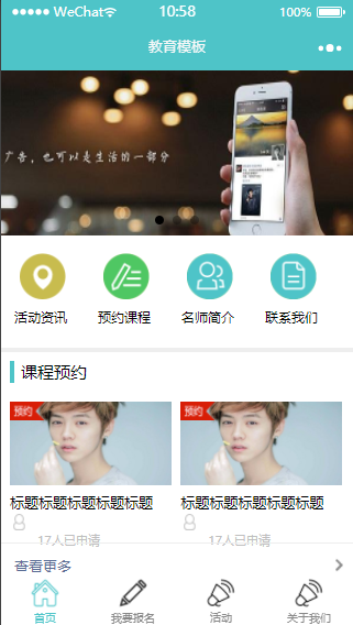 小程序模板简介: 该小程序模板是一款可以在线预约以及在线报名的辅导班宣传微信小程序模板,用户可以轻松在网上进行课程的预约等等。是一款教育类的微信小程序!小程序模板截图: