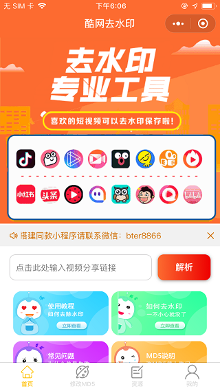 小程序模板简介: 该小程序模板是一款在线去水印的微信小程序,可以帮助你轻松进行水印的去除,支持抖音等等多种主流视频娱乐软件的视频水印去除!小程序模板截图: