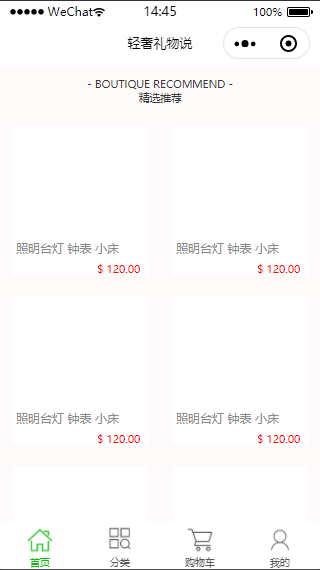 小程序模板简介:        该小程序模板是一款轻奢礼物说的小程序商城源码。帮助用户轻松选购自己的礼物。更有多种精品推荐以及线上结算!小程序模板截图: