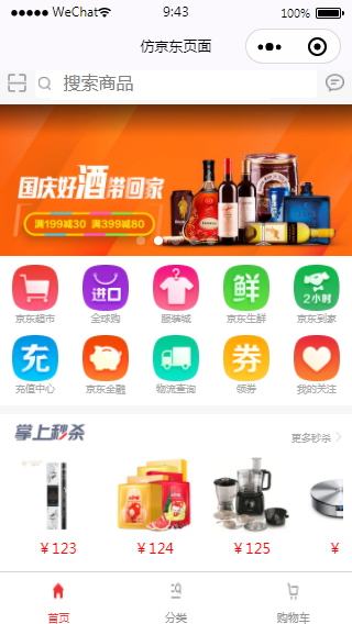 仿京东商城页面微信小程序模板内含3个静态页面,分别为首页、分类、和购物车页面,下载即可使用。