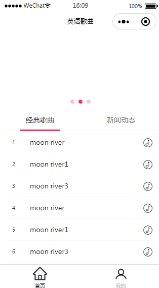 听歌英文歌曲推荐小程序模板有首页以及我的两个页面,推荐歌曲,属于音乐类的小程序。