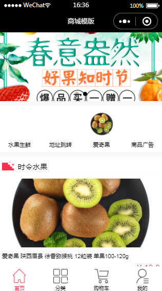 水果生鲜商城微信小程序模板属于商城类小程序,主要售卖生鲜水果类,模板含有4个页面,首页、分类页、购物车以及我的中心。