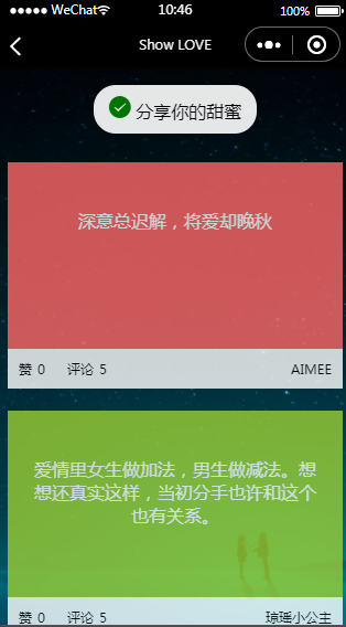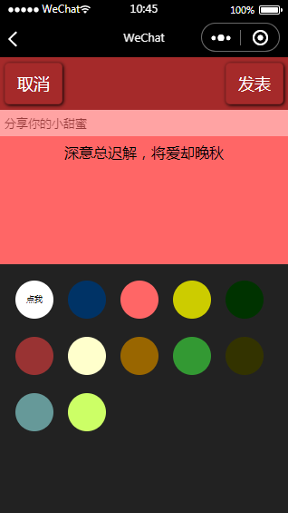 记录恋爱分享日常小程序源码模板属于记录类小程序,登录小程序之后发布自己的文字动态即可。可以选择不同的背景颜色等。
