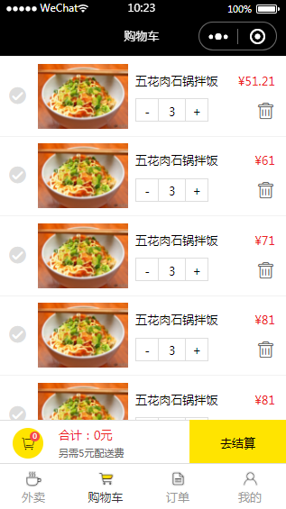 外卖小程序购物车页面代码模板属于小程序中的购物车页面,使用范围广,小程序模板内含源码,经过微信开发者工具实测后,可以使用。