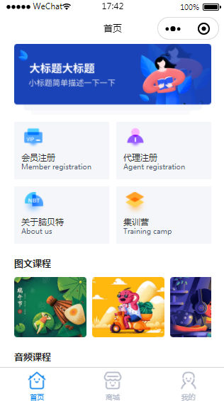 教育培训商城小程序模板是一款商城类模板,小程序模板有首页、商城和我的3个页面,