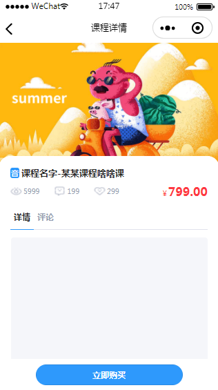 课程培训小程序购买课程页面模板属于立即购买页面,小程序模板内含源码,经过微信开发者工具实测后,可以使用,下载后可自行更改源码或替换图片文字内容等。
