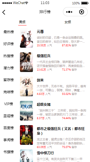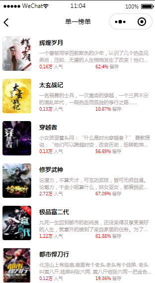 阅读小程序排行榜页面模板展示了不同的排行榜,用户可以选择不同的类型的书籍阅读。模板内含小程序源码,经过微信开发者工具实测后,可以使用。
