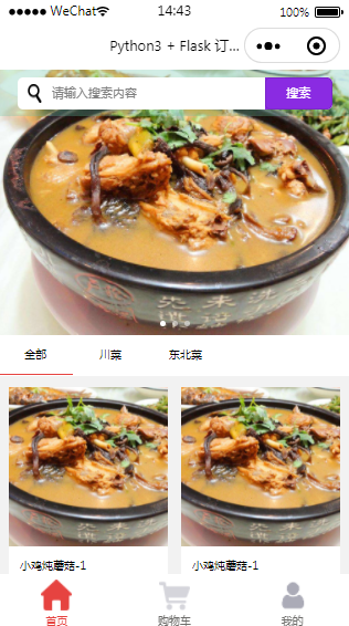 微信美食订餐小程序模板属于餐厅饭店的小程序,有首页、购物车和我的三个页面,用户选择想要的菜品加入购物车付款即可。