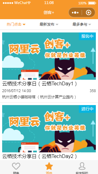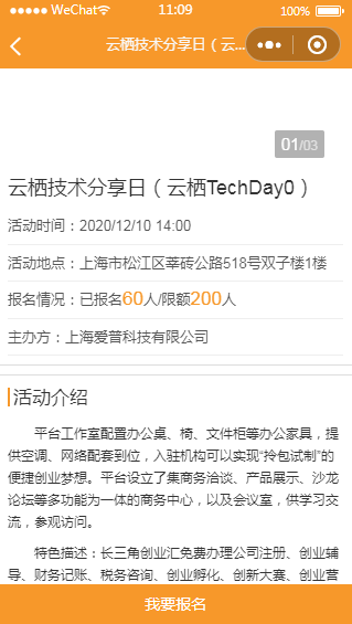 创客小程序活动发布报名页面模板可以查看发布的活动,点击查看活动详情,即可选择自己感兴趣的报名。