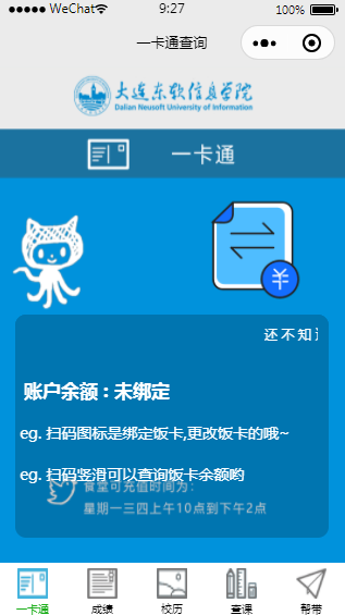 校园一卡通查询小程序模板是一款校园服务的小程序,小程序模板含有一卡通、成绩、校历、查课以及帮带5个页面。用户自行登录即可查看小程序内容。