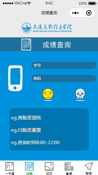 微信成绩查询小程序源码及模板输入学号和密码即可查询各科考试成绩,需注意查询成绩的时间在8:00-22:00
