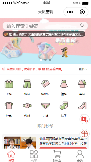 童装服装商场小程序模板是一款销售童装的小程序,属于电商购物类,小程序含有首页、分类页、购物车以及个人中心4个静态页面。