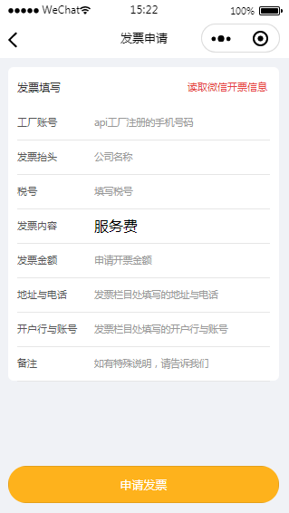 微信申请开发票小程序模板可以在线申请开局发票,填好信息点击申请按钮即可,同时适用于移动支付缴费开具发票。
