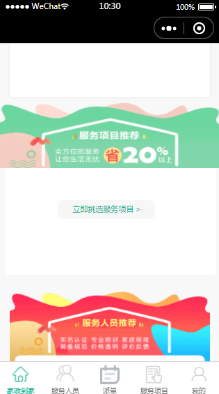 家政服务小程序源码及模板内容丰富,有简约活泼的小程序封面,进入小程序后模板有家政到家、服务人员、拍单、服务项目以及用户中心5个页面,每个页面发布不同的页面信息。