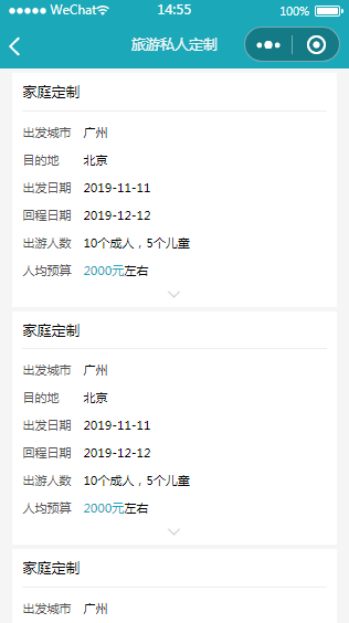 旅行定制小程序订单页可以选择家庭定制或者公司定制,选择出发城市和目的以及预算等信息,小程序源码中含有完整的框架架构便于用户学习,用户下载后可以进行图片或文字内容的更换。