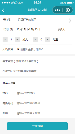 旅行定制小程序立即定制内容页样式模板属于内容详情页,用户填写信息即可。小程序源码中含有完整的框架架构便于用户学习,用户下载后可以进行图片或文字内容的更换。