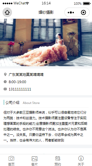 微信婚纱摄影小程序关于我们页面模板主要介绍了摄影机构的公司简介以及联系方式、地址,更加进一步介绍公司信息,让用户更了解公司。小程序源码中含有完整的框架架构便于用户学习,用户下载后可以进行图片或文字内容的更换。