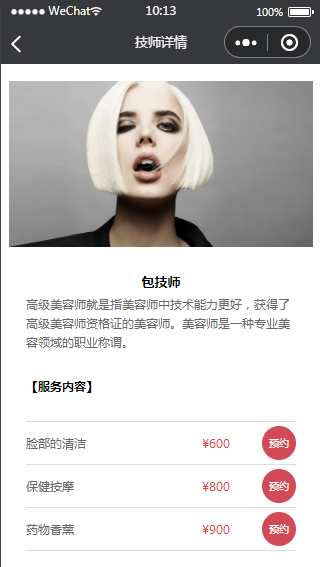 美容小程序服务项目预约页面模板介绍了技师的基本信息以及选择自己需要预约的服务项目,小程序源码中含有完整的框架架构便于用户学习,用户下载后可以进行图片或文字内容的更换。