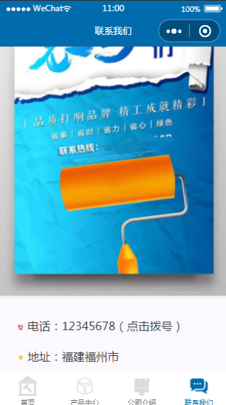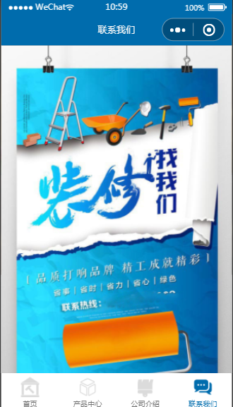 装修公司小程序联系我们页面深蓝模板内含模板源码,经过微信开发者工具实测后,可以使用。小程序源码中含有完整的框架架构便于用户学习,用户下载后可以进行图片或文字内容的更换。