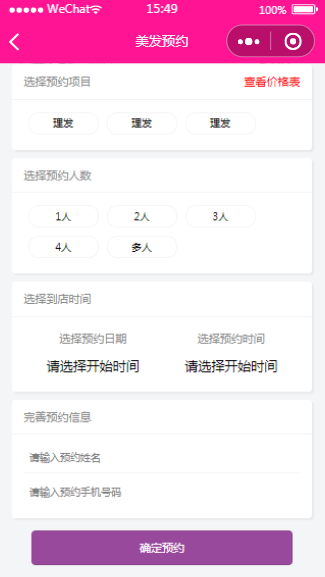 美发小程序服务项目预约页面模板可以选择自己心仪的预约服务,填写预约信息。小程序源码中含有完整的框架架构便于用户学习,用户下载后可以进行图片或文字内容的更换。
