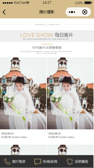 婚纱摄影小程序每日客片页面模板为用户展示了每日客片的样片展示,更方便用户选择。小程序模板内含源码,用户在下载之后直接登录即可使用。