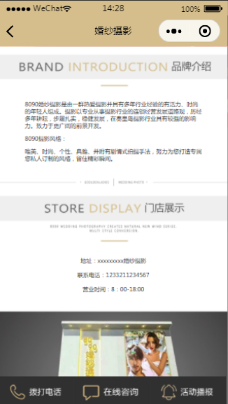 婚纱摄影小程序门店介绍页面模板更加详细的介绍了婚纱摄影店的详细情况,让用户更加了解该店铺。