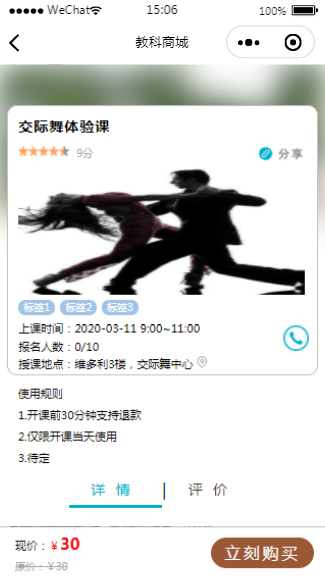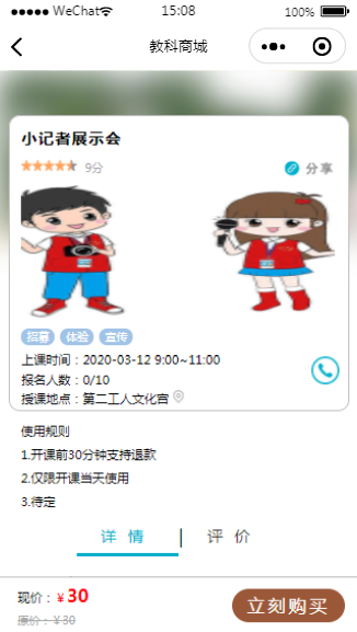 线上教育教科商城小程序详情页模板展示了课程的详情页,小程序整体设计风格清晰简约,该小程序模板内含模板源码,用户在下载之后可以替换图片或文字内容。