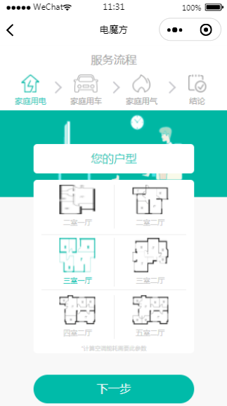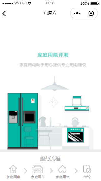 家庭用能评测小程序模板可以选择家庭用电用车用电气的情况,最后为家庭评测使用情况,得出结论,帮助家庭省电节能。