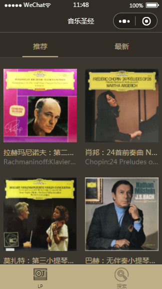 音乐类小程序模板有推荐页和最新页两个页面,推荐页推荐了各类钢琴演奏曲,小程序源码中含有完整的框架架构便于用户学习,用户下载后可以进行图片或文字内容的更换。