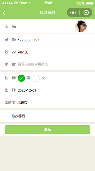 绿色小程序模板修改资料页面,用户在登录之后可以查看或修改个人资料。小程序模板内含源码,经过微信开发者工具实测之后可以使用。