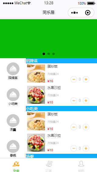 美食外卖小程序模板有外卖页、订单页以及我的主页3个页面,小程序源码中含有完整的框架架构便于用户学习,用户下载后可以进行图片或文字内容的更换。