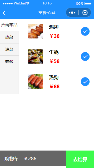 美食餐厅点餐小程序模板点餐页面,菜品分类有热菜、凉菜、套餐。小程序模板内包含源码,用户可以通过微信开发者工具打开,下载之后,可以自行替换文字或图片内容,小程序模板有完整的框架结构,方便大家参考学习。