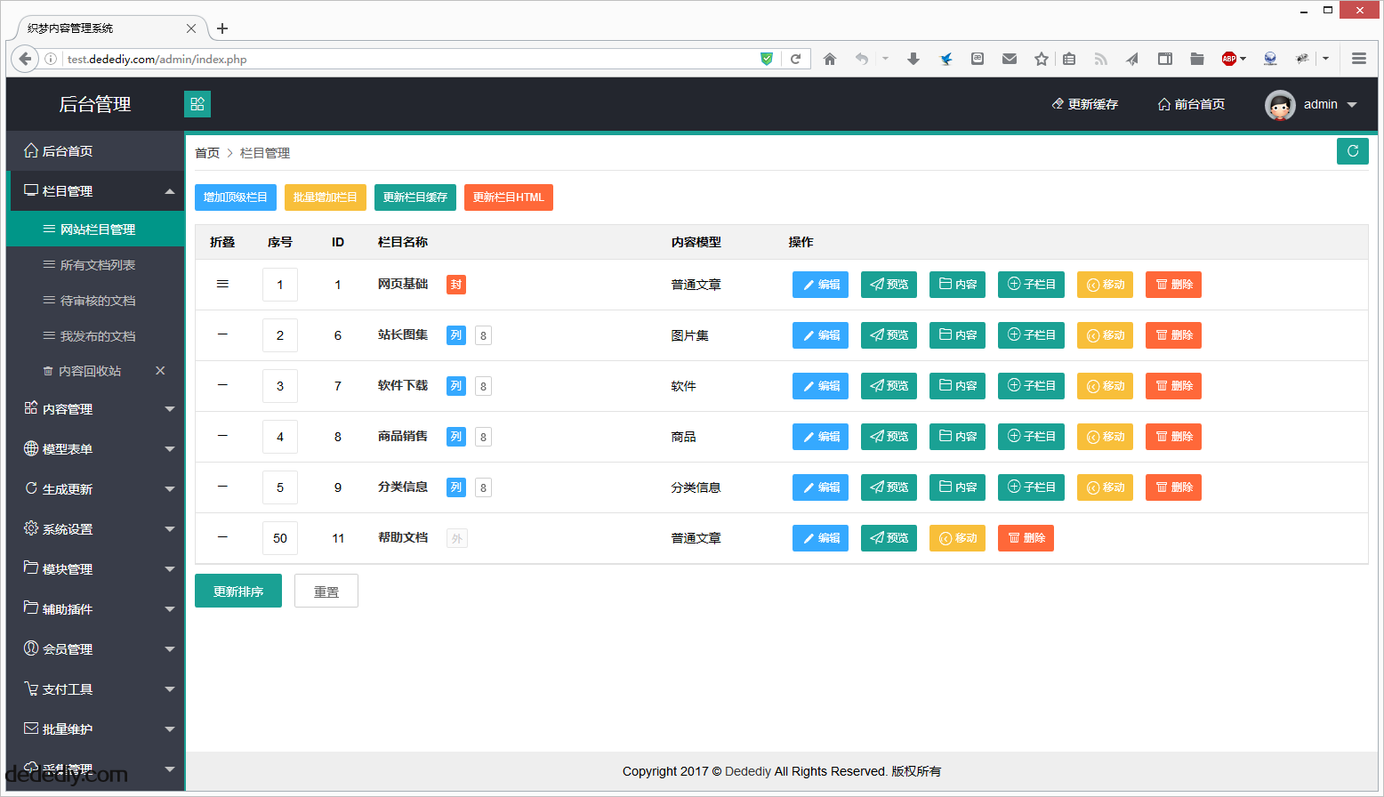 上传完文件后,清空浏览器临时文件,浏览器里打开 http://域名/dede 预览效果