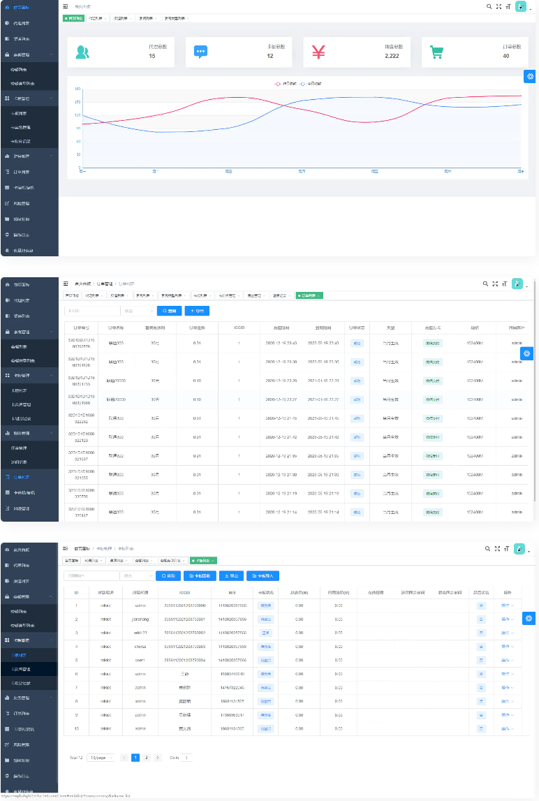 后台功用简介:代理列表办理,渠道列表办理,套餐办理,卡板办理,财务办理,订单列表,