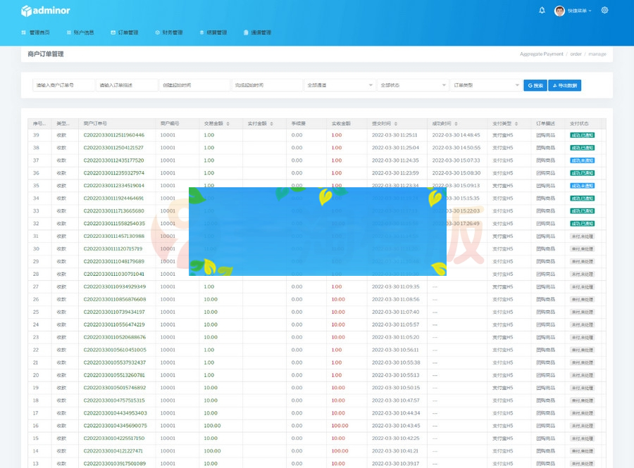 【帐号类型】系统后台多类型管理员、商户代理、普通商户、接口用户;对用的板块后台都不一样相关的数据统计齐全有效。