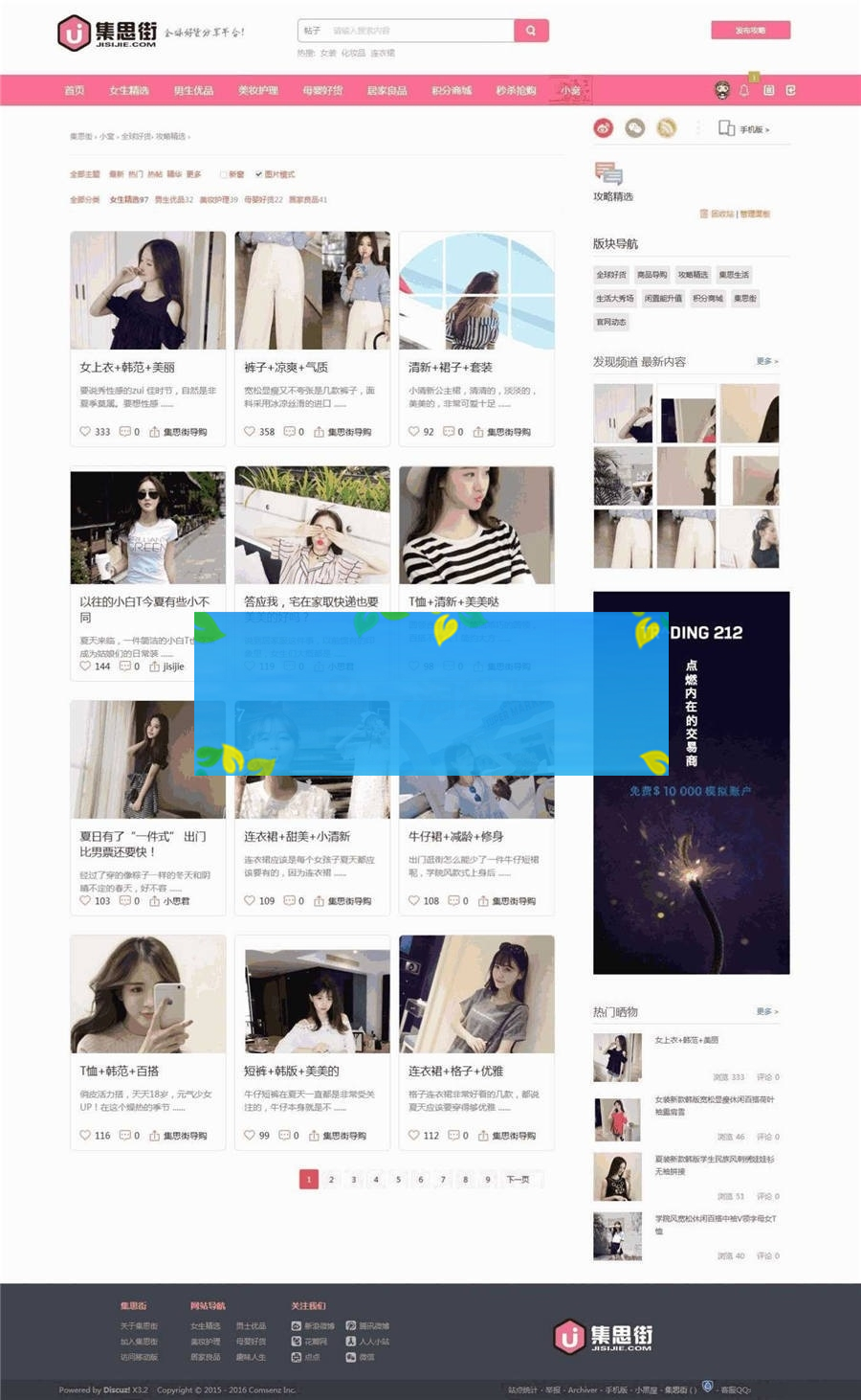 Discuz仿集思街淘宝客模板,采用discuzX3.2内核制作,模板代码优化完善,大气唯美,粉红色更贴合女性类的淘客商品推广。
