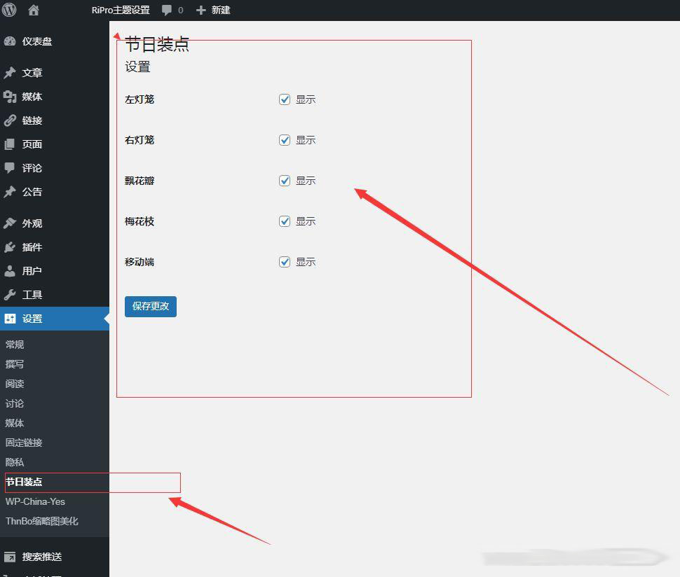 启用后回跳转到插件设置页面(可以选择显示顶部左右灯笼,花瓣飘落,梅花枝等)