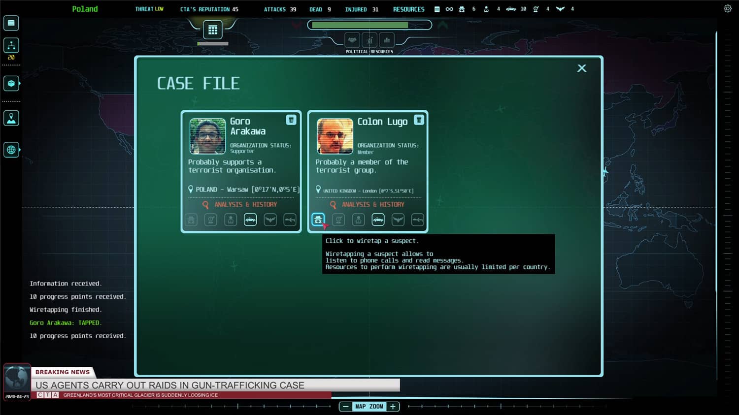 《反恐专家》是一款单人管理类的模拟经营游戏。在游戏中你将扮演一名反恐专家,你需要使用现代监听技术获取情报,寻找恐怖组织网络中的头目,破解一次又一次的恐怖份子行动!