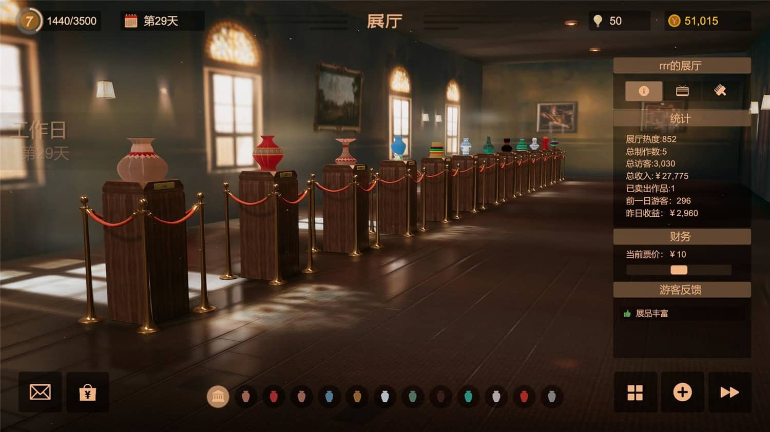 《陶艺大师》是一款注重氛围与虚拟生活体验的陶艺主题的创造+模拟经营类游戏。创造独一无二的陶艺作品并经营一家属于你的展馆,与参观者产生奇妙的互动,游戏中作为一名优秀的陶艺师,你将参与到陶艺制作的基本环节中,制作属于你的独一无二的陶艺作品,并将它们摆在展厅中供人参观并与游客产生互动!通过不断的创造获得更多材料,制作出更加精美的作品并拓建你的展厅,最终打造一家具有影响力的陶艺展馆。
