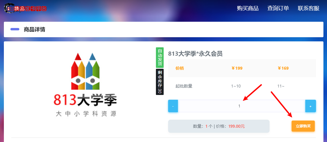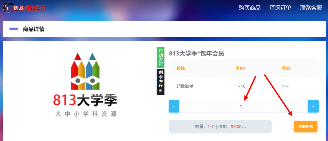 三、选择好数量后,点击购买 (批发10个以上有优惠哦:包年会员69元,永久会员169元)