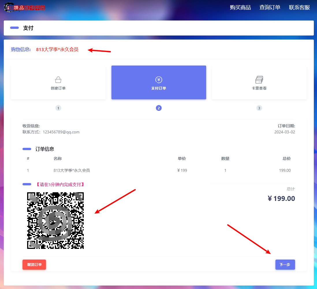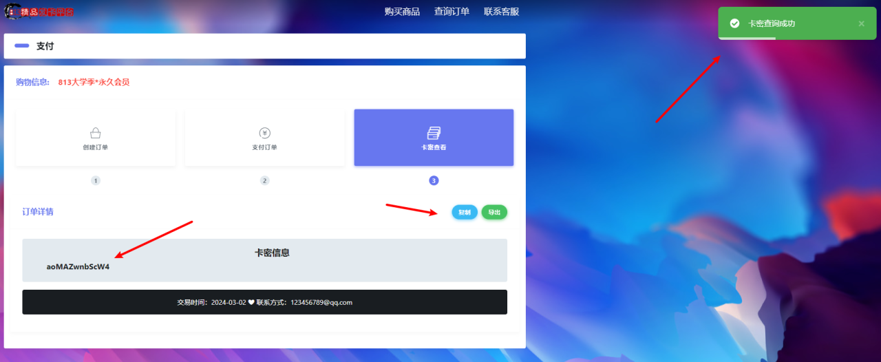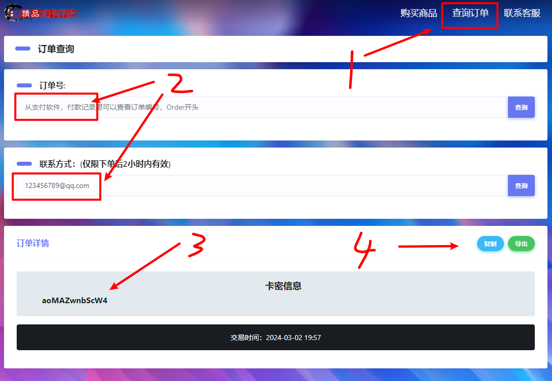 点击【查询订单】,输入订单号或者联系方式,点击【查询】,即可查询到卡密信息